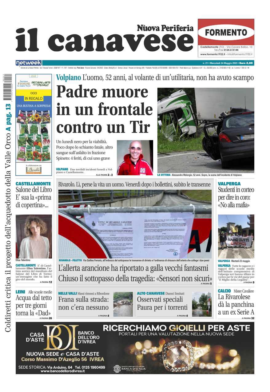In questa edizione in primo piano il sangue che ha macchiato le strade del Canavese lunedì 22 maggio: due incidenti a Castellamonte in frazione Spineto che ha visto coinvolte tre auto e dove è rimasto gravemente ferito un uomo, e Volpiano dove ha perso la vita un uomo di 52 anni. A Rivarolo l’Amministrazione chiude a causa del maltempo il sottopasso dove morì annegato Guido Zabena, ora gestito da Smat. A causa del maltempo  a Ribordone si stacca un masso dalla montagna e cade sulla strada: sfiorata la tragedia.