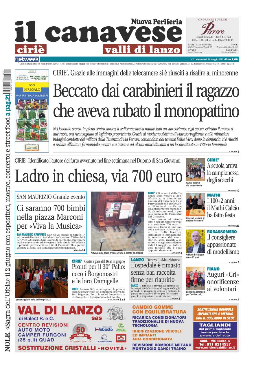 In prima pagina il ladro che sabato aveva rubato dalla cassetta delle offerta nel Duomo di San Giovanni a Ciriè. Beccato dai Carabinieri il ragazzo che a Ciriè aveva rubato il monopattino ad un coetaneo dopo averlo minacciato lo scorso febbraio. A San Maurizio previsti 700 bambini in piazza Marconi per “Viva la musica”.