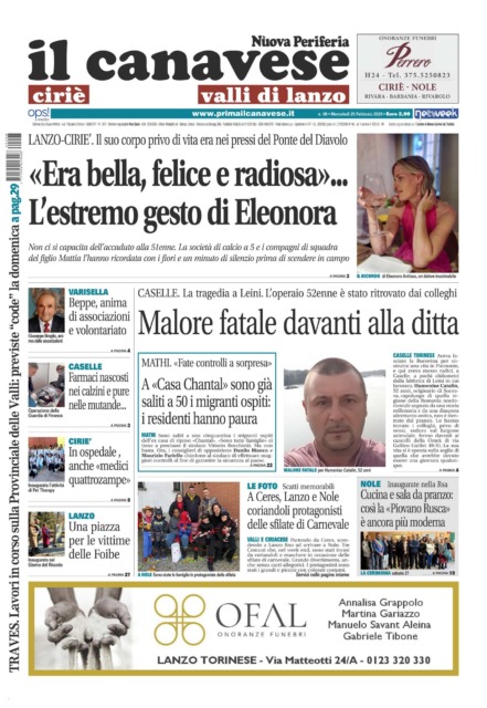 In prima pagina il ritrovamento del corpo senza vita di Eleonora, 51 anni, sotto al Ponte del Diavolo a Lanzo: amici e familiari cercano un “perchè”. L’improvvisa scomparsa di Humeniuc Catalin, 52 anni della Romania, ma da diversi anni residente in Italia, ritrovato senza vita nel furgone della ditta per cui lavorava, fuori dai cancelli, colpito da un malore improvviso. A casa Chantal a Mathi sono già saliti a 50 gli ospiti della struttura, e da più parti si chiede maggiore vigilanza.