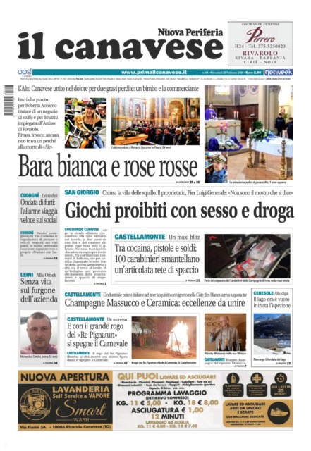 n questa edizione in primo piano la scoperta a San Giorgio della villa, ora sotto sequestro, che, secondo gli inquirenti, sarebbe stata teatro di festini a luci rosse con anche l’utilizzo di droghe. Il terribile addio del Canavese al piccolo Ale, 7 anni, la cui morte è ancora inspiegabile e si attende l’esito dell’autopsia, e la scomparsa di Roberta, portata via da un male incurabile all’età di 54 anni. La maxi retata dei carabinieri della compagnia di Ivrea che in Canavese hanno sgominato un’articolata rete di spaccio: sequestrata droga, armi e denaro.