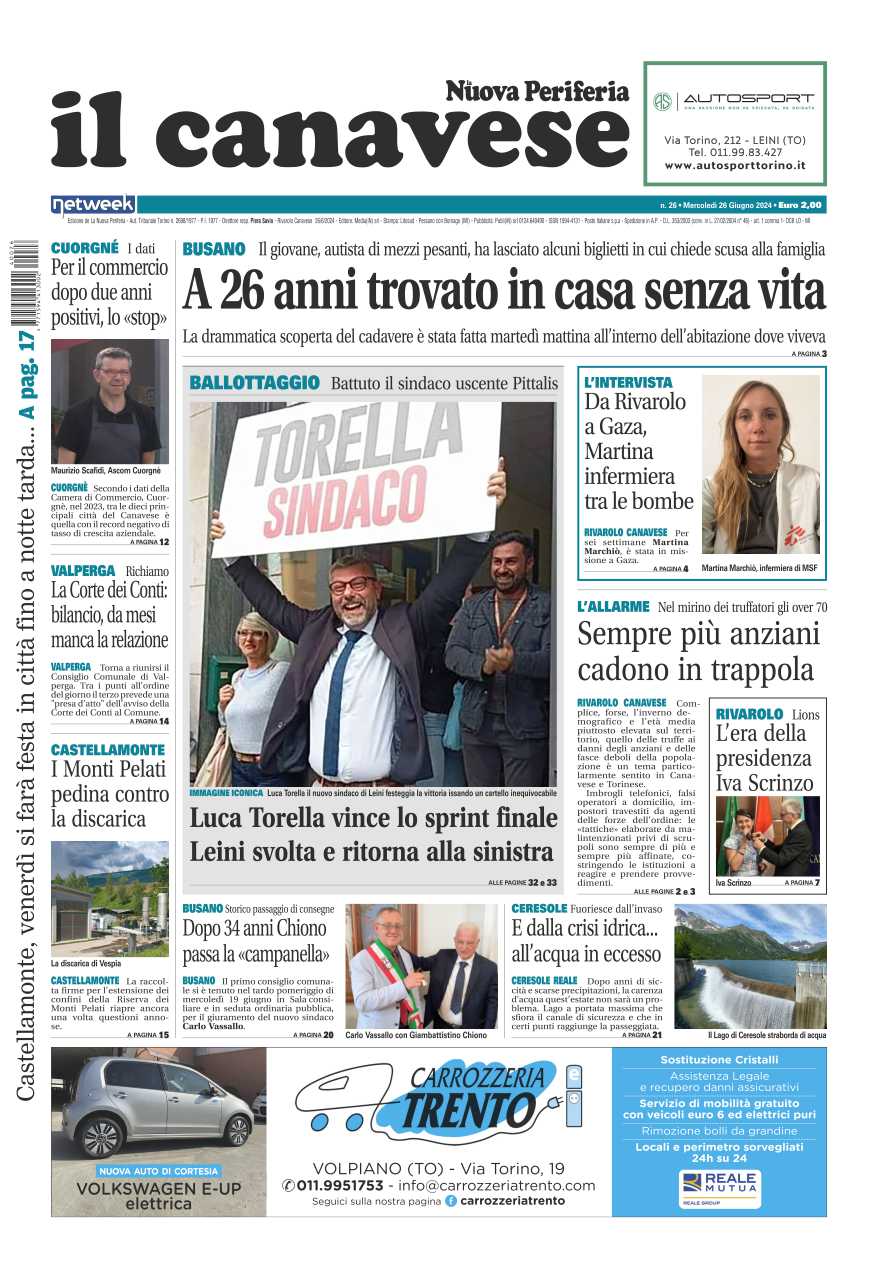 In questa edizione in primo piano la tragedia di Busano: trovato senza vita nella casa dove viveva insieme ai genitori ad appena 26 anni. A Leini il ballottaggio incorona Luca Torella nuovo sindaco, le urne gli danno ragione sul primo cittadino uscente Renato Pittalis. L’intervista a Martina Marchiò, 32enne infermiera rivarolese per sei mesi sotto le bombe di Gaza a curare i malati con Medici senza Frontiere
