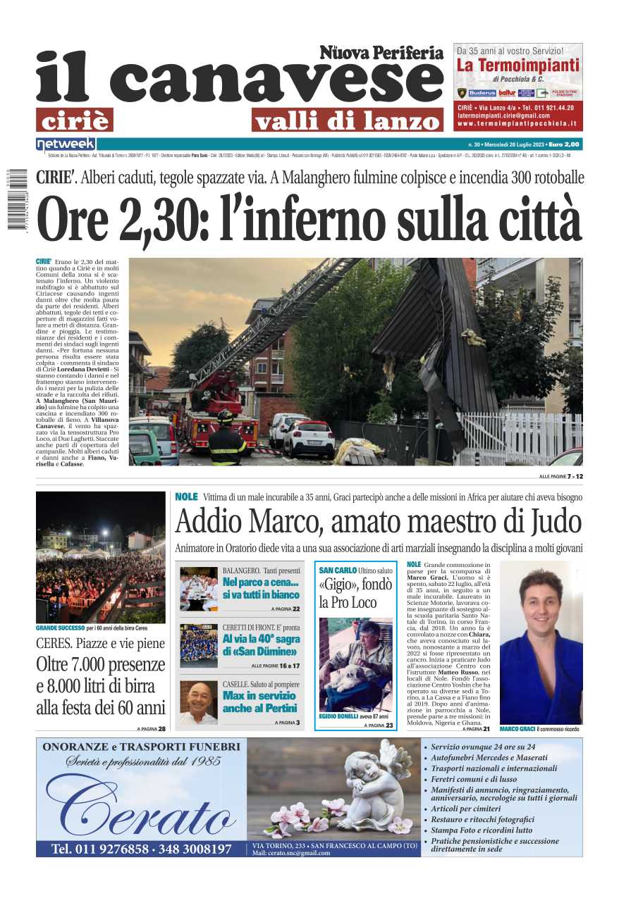 In prima pagina il maltempo che ha colpito Ciriacese e Valli di Lanzo nella notte fra alberi abbattuti, tegole precipitate e il rogo causato da un fulmine che a Malanghero ha mandato a fuoco 300 rotoballe. L’addio a Marco, 35enne maestro di judo, vittima di un male incurabile. E poi la festa della Ceres a Ceres: record di presenze per il paese e festa riuscitissima fra birra, musica e divertimento.