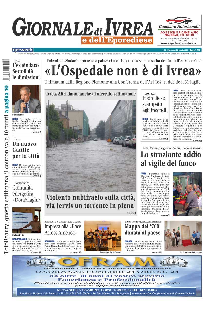In evidenza la protesta dei sindaci del Canavese occidentale, della Valchiusella e di parte dell’Eporediese davanti a Palazzo Lascaris per contestare la scelta dell’area Montefibre per la costruzione del nuovo nosocomio: “L’ospedale non è di Ivrea”. Lo straziante addio al Vigile del fuoco Massimo Viglierco morto in servizio mercoledì scorso. Il violento nubifragio che ha investito l’Eporediese: a Ivrea nuovi disagi e via Jervis un torrente in piena.