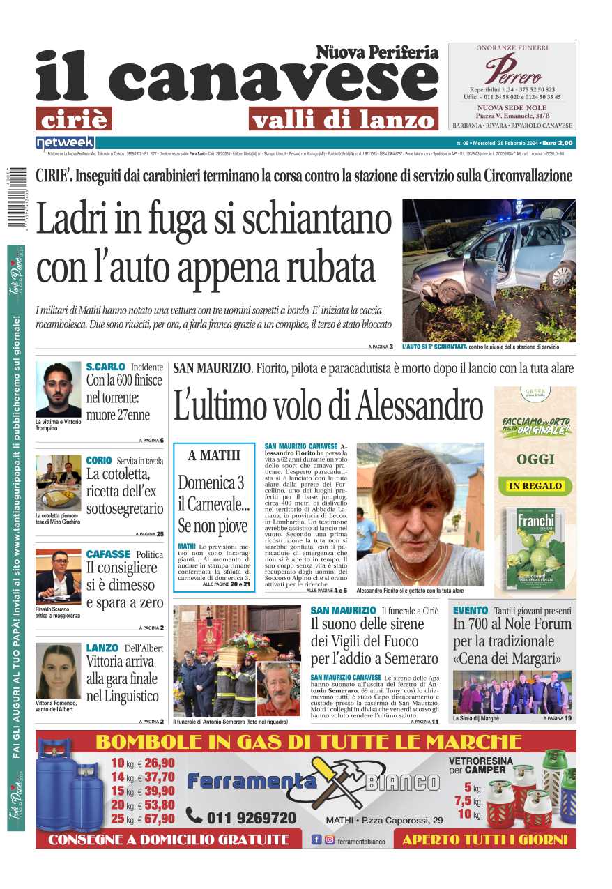 In prima pagina ladri in fuga si schiantano con l’auto appena rubata inseguiti dai carabinieri. San Maurizio piange Alessandro Fiorito, 62 anni, pilota e paracadutista esperto, schiantatosi al suolo dopo un lancio con la tuta alare. L’ultimo saluto a Ciriè ad Antonio Semeraro, 69 anni, è stato capo distaccamento e custode presso la caserma dei Vigili del fuoco di San Maurizio.
