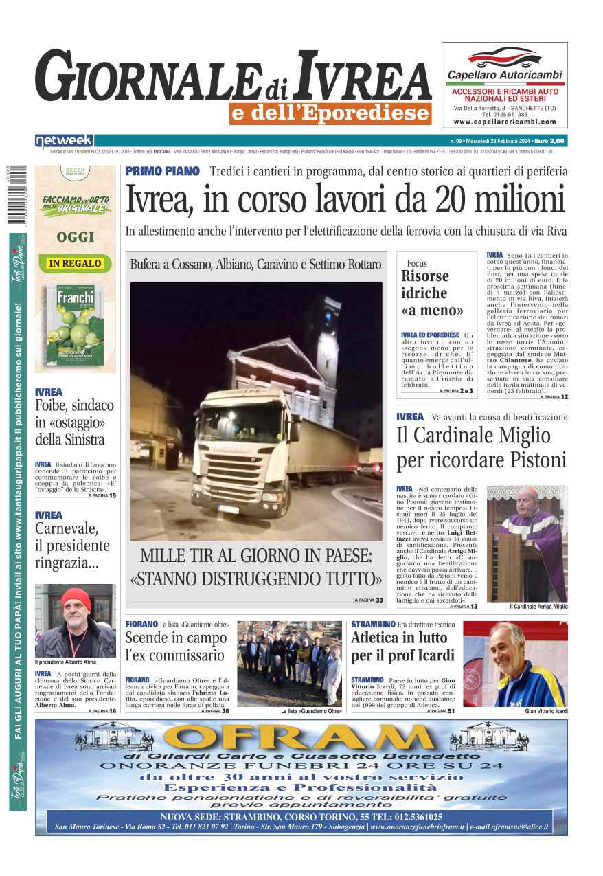 In evidenza i cantieri aperti a Ivrea:in corso lavori per 20 milioni di euro in tutta la città. Bufera a Cossano, Albiano, Caravino e Settimo Rottaro: mille tir al giorno transitano sulle strade dei paesi: “Stanno distruggendo tutto”. A Strambino l’atletica e tutto il paese in lutto per la scomparsa di Gian Vittorio Icardi, per anni professore di educazione fisica alla scuola media.