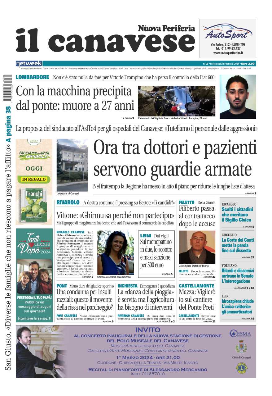 In questa edizione in primo piano ancora le candidature per le elezioni a Rivarolo: sarà Helen Ghirmu il candidato sindaco della Giunta uscente, mentre Marina Vittone medita una corsa in solitaria e la destra ancora non scioglie le riserve. La morte di Vittorio Trompino, domenica sera, finito con l’auto giù dal ponte e Lombardore. Il sindacato in pressing sull’Asl To4: “basta aggressioni, negli ospedali e nei presidi sanitari servono le Guardie giurate”; intanto la Regione Piemonte stila un programma per ridurre le liste d’attesa di visite ed esami.
