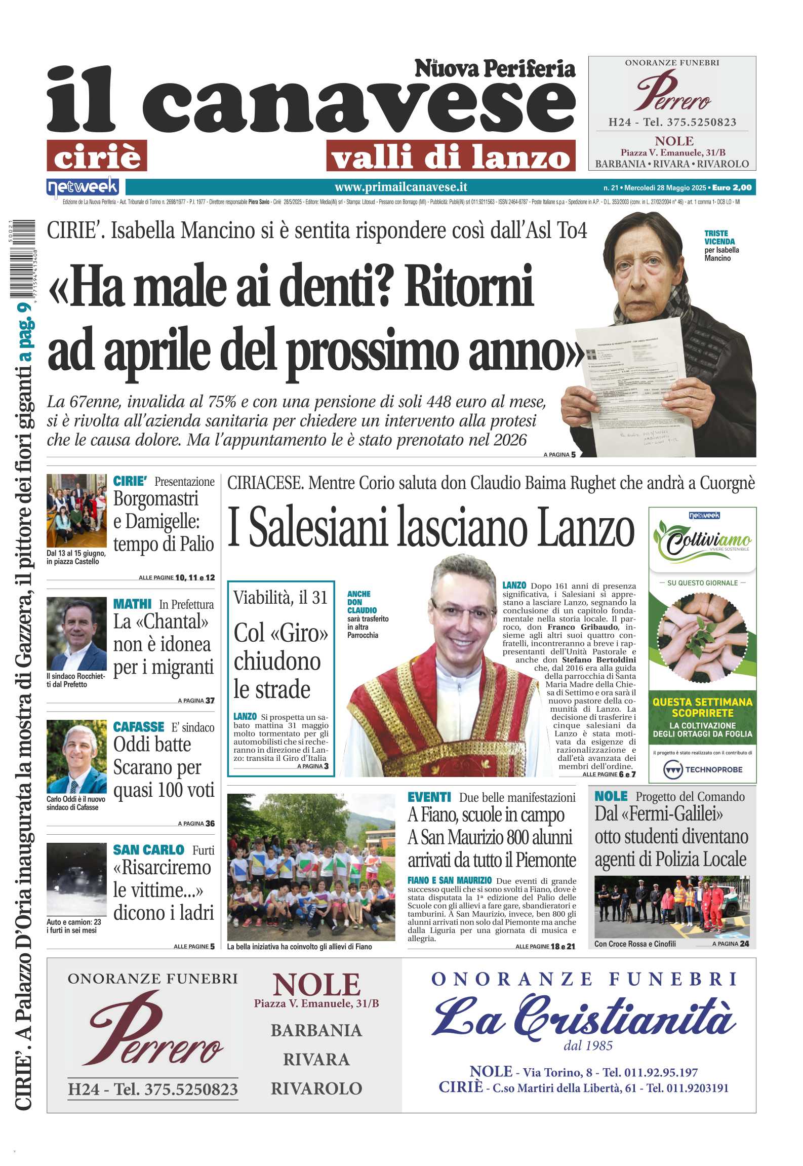In prima pagina la lunga attesa per le prestazioni odontoiotriche dell’Asl: 67enne invalida al 75% rimandata ad aprile 2026 per risolvere un problema ai denti. Chiesa: a Corio don Claudio Baima Buchet saluta i fedeli, andrà a Cuorgnè, mentre i salesiani lasciano Lanzo. Elezioni a Cafasse: Carlo Oddi è il nuovo sindaco.