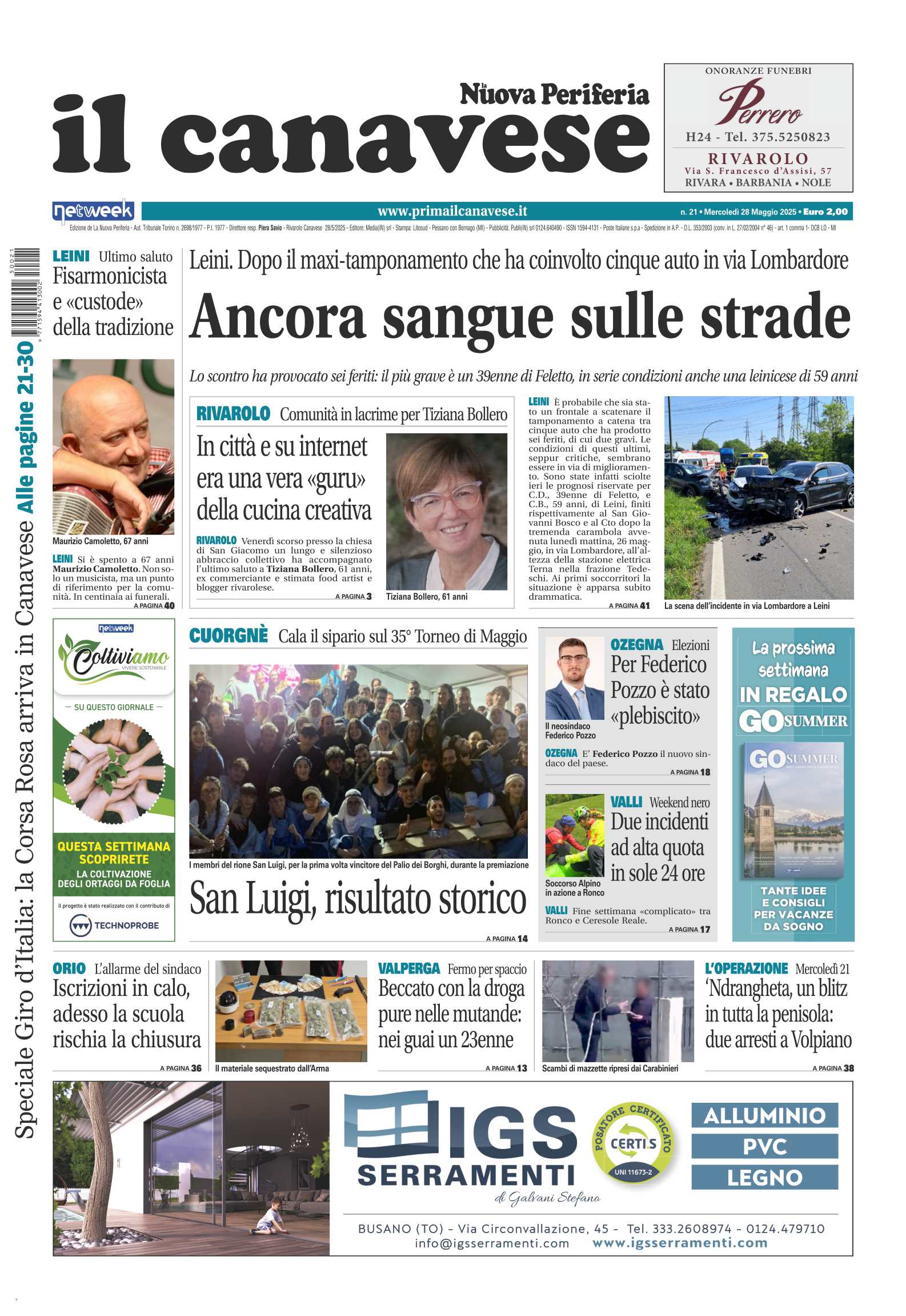 In questa edizione in primo piano la strage sulle strade del Canavese: ancira sangue. La morte di tiziana Bollero a Rivarolo, food designer e blogger, volto noto e molto apprezzato. E’ calato il sipario sul Torneo di Maggio, per San Lorenzo uno storico risultato.