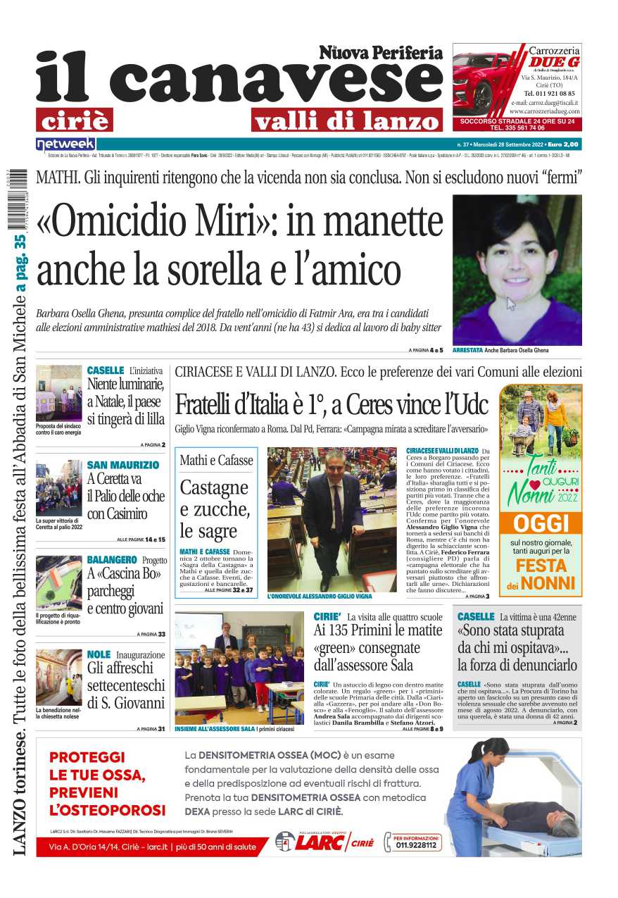 In prima pagina ancora l’omicidio di Fatmir Ara: arrestate altre due persone, la sorella dell’assassino reo confesso e un amico. Elezioni, FdI vince anche nel nostro territorio, i dati Comune per Comune. A Caselle donna stuprata dall’uomo che la ospitava.