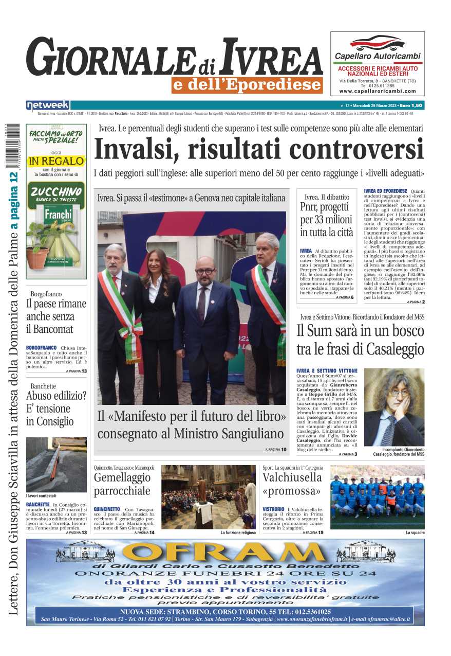 In evidenza l’analisi dei risultati dei test invalsi: le percentuali degli studenti che superano i test sulle competenze sono più alte alle elementari, alle superiori caduta sull’inglese: meno del 50% degli studenti raggiunge livelli adeguati. Ivrea Capitale italiana del libro passa il testimone a Genova: il Manifesto per il futuro del libro consegnato al Ministro Sangiuliano. Pnrr, progetti per 33 milioni in tutta la città.