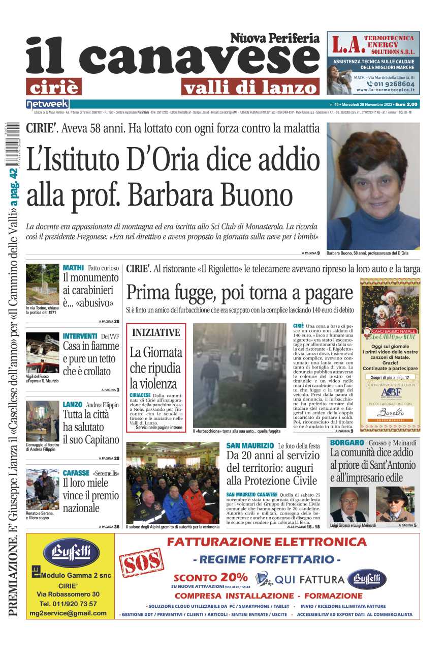 In prima pagina il lutto che ha colpito il Ciriacese a seguito dell’improvvisa scomparsa della professoressa Barbara Buono, insegnante dell’Istituto Doria di Ciriè. A Lanzo si “costituiscono” gli autori della bravata al ristorante Il Rigoletto, fuggiti senza pagare: sono tornati a saldare il conto. Anche nel Ciriacese tante le iniziative nella Giornata mondiale contro la violenza sulle donne.