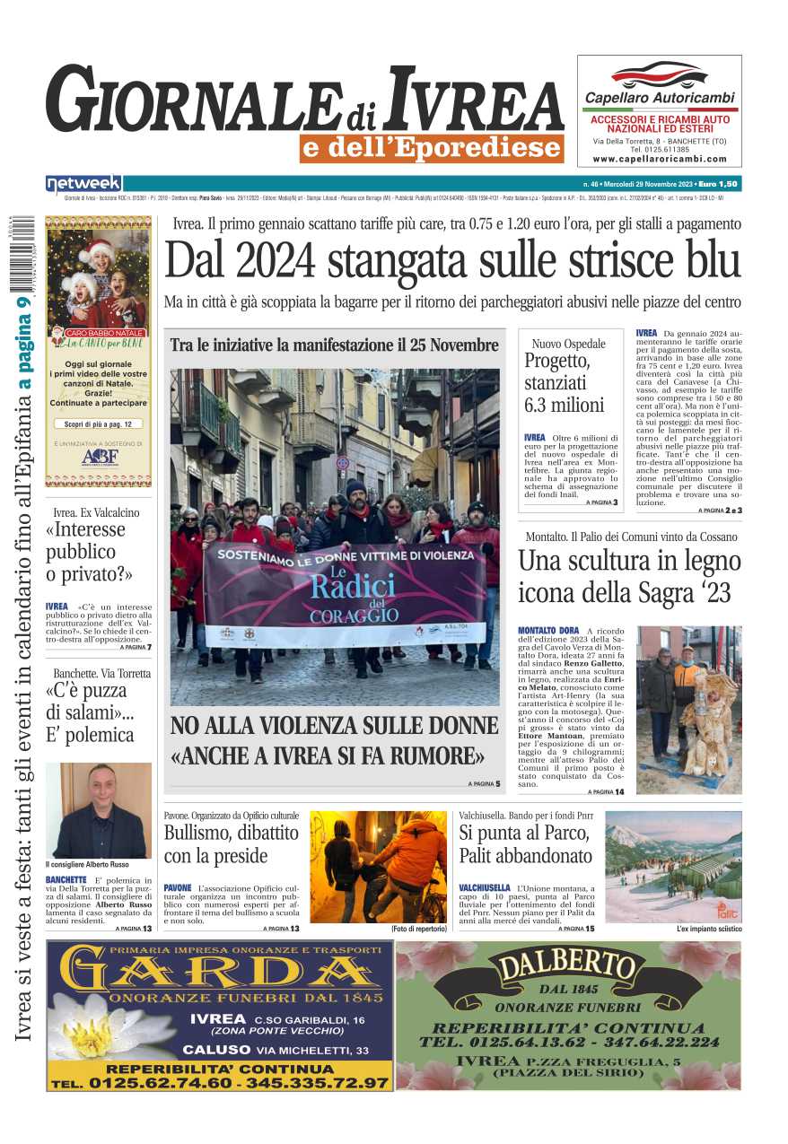 In evidenza la stangata in arrivo nel 2024 a Ivrea per la sosta a pagamento: parcheggiare sulle strisce blu costerà 1,20 euro all’ora. Per il progetto del nuovo ospedale di Ivrea stanziati 6,3 milioni di euro. A Ivrea “fa rumore” il No alla violenza della marcia in occasione delle manifestazioni del 25 novembre.