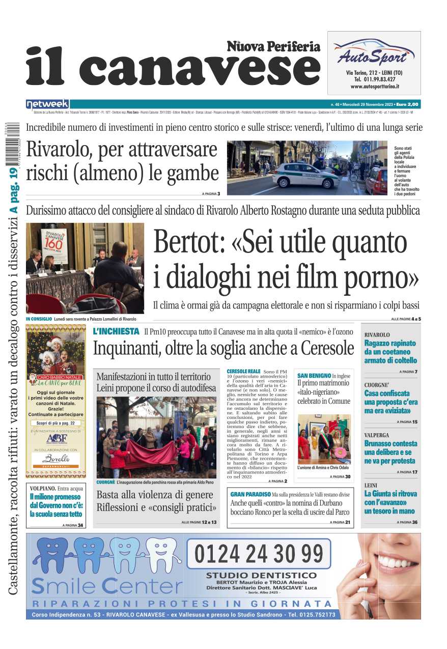 In questa edizione in primo piano l’inchiesta sulla qualità dell’aria in Canavese: il Pm10 preoccupa tutto il Canavese, inquinamento oltre i limiti anche a Ceresole. A Rivarolo in Consiglio comunale non si risparmiano colpi, il clima è già da campagna elettorale, Bertot a Rostagno: “Sei utile quanto i dialoghi nei film porno”. In occasione del 25 novembre, Giornata mondiale contro la violenza sulle donne, tante le iniziative in tutto il territorio.