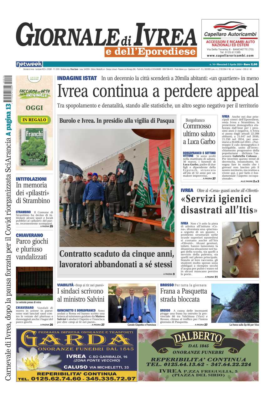 In evidenza la crisi di Ivrea: la città continua a perdere appeal, fra spopolamento e denatalità segno demografico in negativo. L’ultimo commosso saluto a Luca Garbo, scomparso ad appena 52 anni a causa di un malore improvviso. Lavoratori Carrefour in presidio la vigilia di Pasqua a Burolo e Ivrea: contratto scaduto da 5 anni.