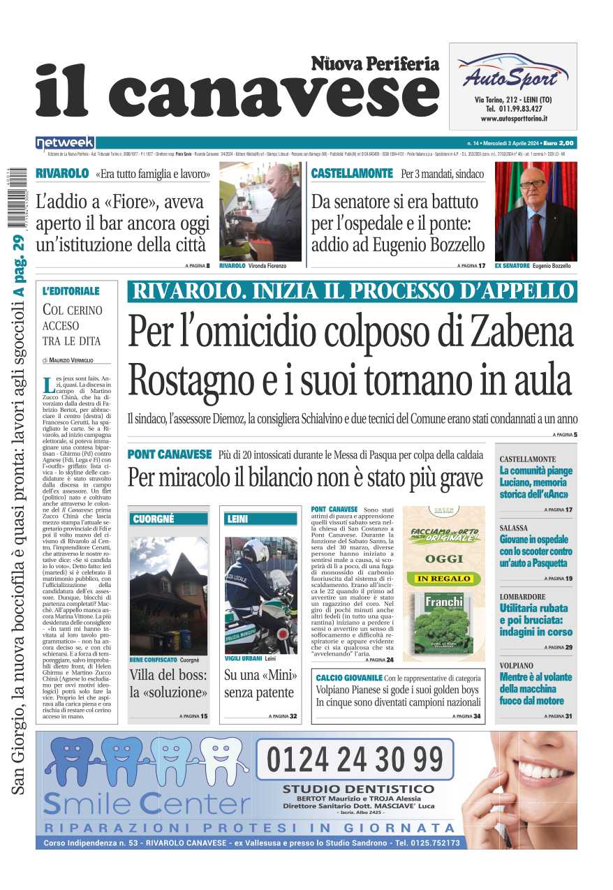 In questa edizione in primo piano il processo per la morte di Guido Zabena nel sottopasso al confine fra Rivarolo e Feletto, si torna in aula nel processo di appello; sul banco degli imputati il sindaco di Rivarolo Alberto Rostagno, il suo vice Francesco Diemoz, l’allora assessore Lara Schialvino, un tecnico comunale e il capo dei vigili urbani. Addio all’ex senatore Eugenio Bozzello, tutto il Canavese in lutto per la sua scomparsa. La Messa della vigilia di Pasqua è da incubo: una fuga di gas rischia di causare una strage a Pont Canavese.