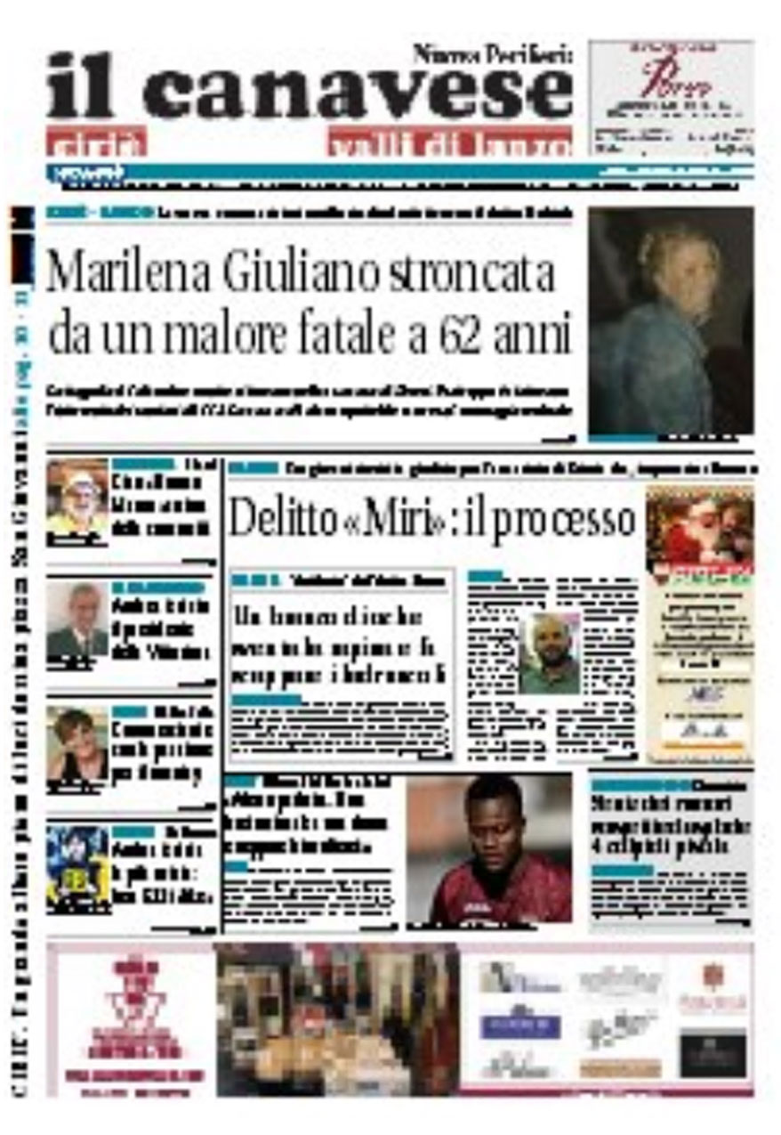 In prima pagina il lutto che ha colpito Ciriacese e Valli di Lanzo: se n’è andata improvvisamente Marilena Giuliano, vittima di un malore improvviso a 62 anni. Delitto Miri: tre giovni rinviati a processo per l’omicidio di Fatmir Ara. Dopo le accuse dell’ex fidanzata Demba Seck rompe il silenzio: “Adesso parlo io. Non farei male del male a una donna”.