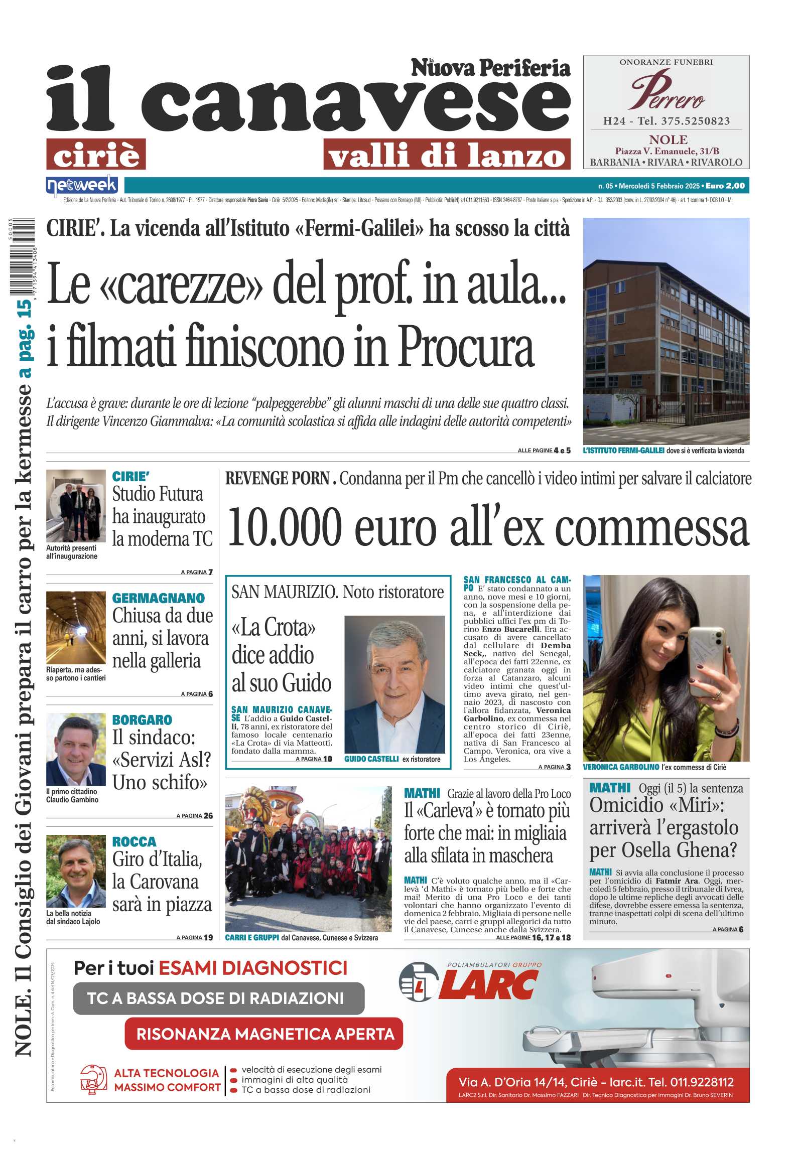 In prima pagina terremoto a Ciriè, un prof del liceo Fermi-Galilei accusato di palpeggiare gli alunni durante le lezioni, il dirigente rimanda ogni commento alle decisioni del giudice. Giunto a conclusione il caso di revenge porn che vedeva accusato l’ex calciatore del Toro Demba Seck, condannato il pm che cancellò i video, 10mila euro alla ex commessa vittima del reato. San Maurizio piange Guido Castelli, ex ristoratore del «La Crota».