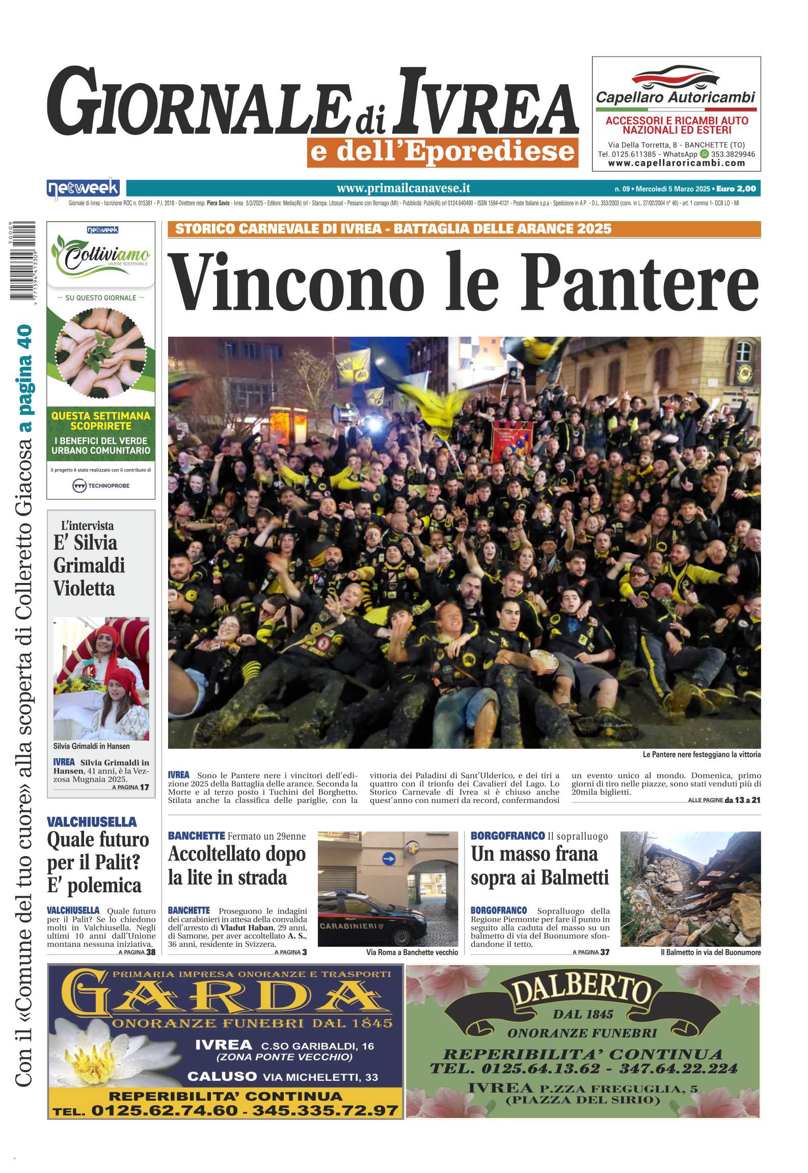 In evidenza le giornate di chiusura del Carnevale con le foto dei vincitori della Battaglia e della Mugnaia 2025 Silvia Grimaldi. Terrore a Banchette: accoltellato in strada è grave ma non in pericolo di vita, il suo attentatore è stato arrestato. A Borgofranco attimi di paura per la frana che ha interessato la zona dei balmetti: il tetto di una struttura è stato sfondato.