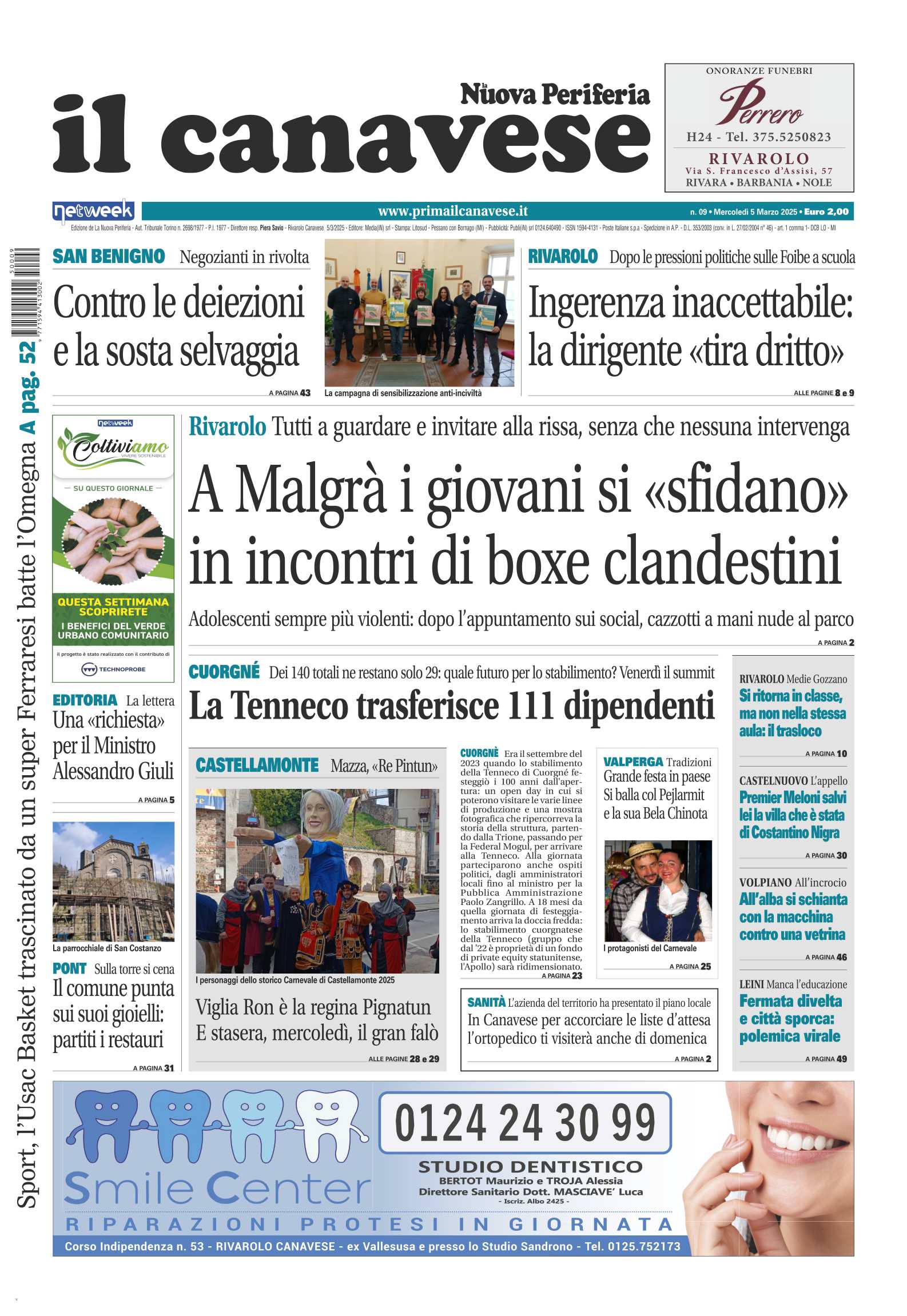 In questa edizione in primo piano l’episodio di violenza fra giovanissimi al Malgrà, botte da orbi e nessuno è intervenuto per sedare la rissa. A Cuorgnè la Tanneco trasferisce 111 dipendenti, appena 18 mesi fa aveva festeggiato i 100 anni di attività del sito. A Rivarolo è polemica per l’ingerenza della politica nell’istruzione: è un caso intromissione del consigliere regionale sulla conferenza sulle Foibe al liceo Moro.