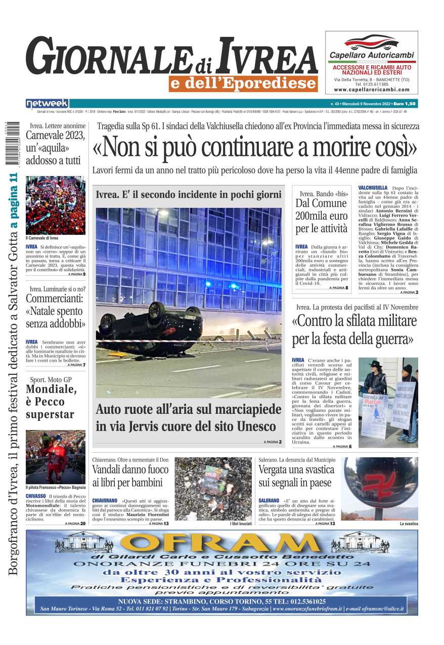 In evidenza la rabbia dei sindaci dopo la morte del 44enne papà di Castellamonte precipitato nella scarpata fra Baldissero e Vidracco: “Strada pericolosa e lavori fermi”. Brutto incidente in via Jervis a Ivrea, è il secondo in pochi giorni. A Ivrea Natale spento senza addobbi.