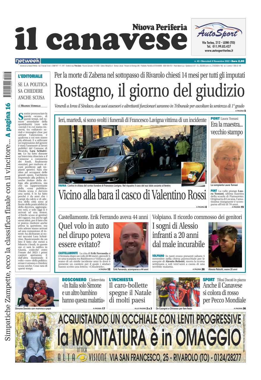 In questa edizione in primo piano l’ultimo saluto di Favria a Francesco Lavigna, morto in un drammatico incidente in moto. Fra poche ore il giorno del giudizio: attesa per la sentenza del processo per la morte nel sottopasso di Rivarolo di Guido Zabena, per Rostagno, Diemoz, Schialvino e due impiegati comunali il PM ha chiesto 14 mesi. Il dramma dell’incidente in cui ha perso la vita Erik, giovane papà di Castellamonte precipitato in una scarpata fra Vidracco e Baldissero.
