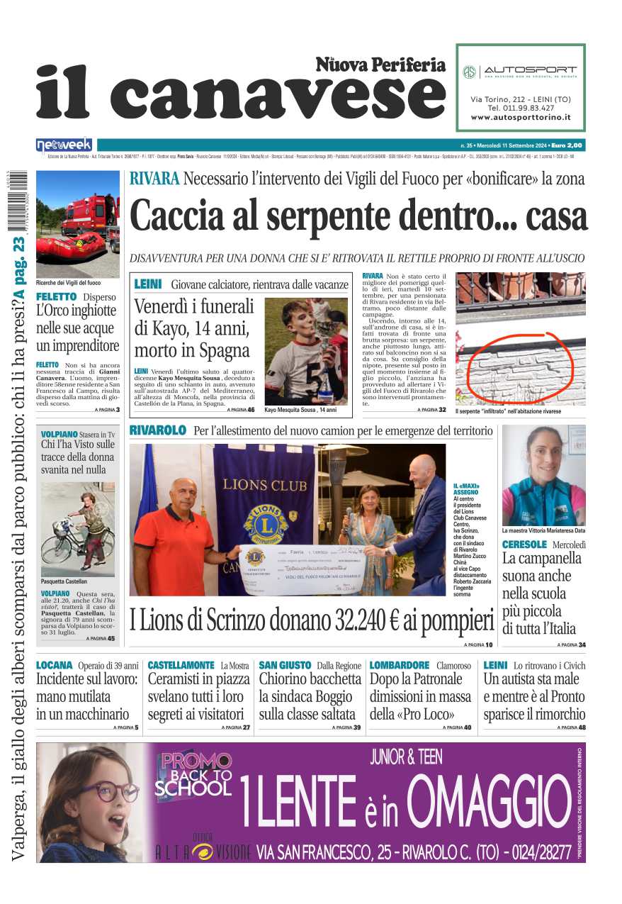 In questa edizione in primo piano l’ultimo saluto a Kayo Mesquita Sousa il 14enne deceduto a seguito di uno schianto in auto avvenuto in Spagna. A Rivara la disavventura di una donna, costretta a chiedere aiuto ai Vigili del fuoco per stanare un serpente che si era intrufolato nella sua abitazione. Generosa donazione dei Lions Club Canavese Centro ai Vigili del fuoco rivarolesi per l’acquisto della nuova autopompa.
