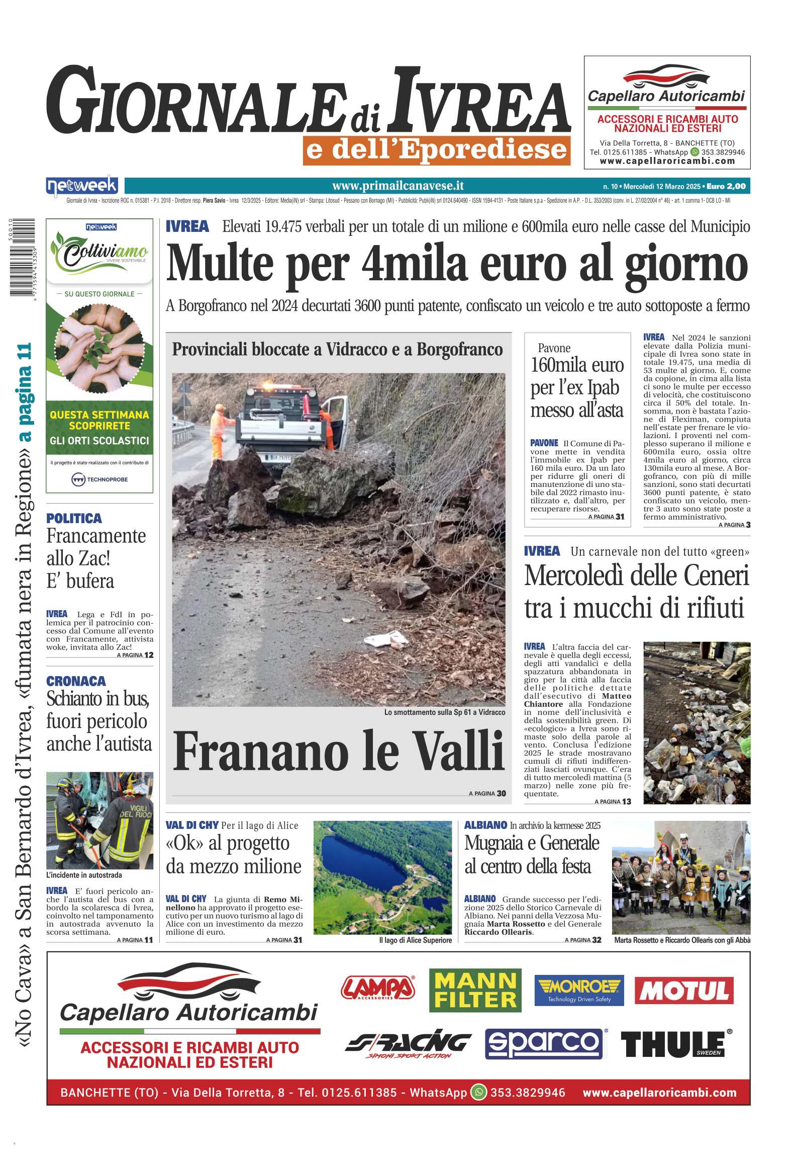 In evidenza l’inchiesta sulle multe staccate dai civich sul territorio: la media è di 4mila euro al giorno (a Borgofranco persi dagli automobilisti 3600 punti patente mentre Ivrea “guadagna” un milione e 600mila euro nel 2024). A Pavone l’ex Ipab va all’asta per 160mila euro. Franano le Valli: tra Vidracco e Vistrorio bloccata la Sp 61 a causa del crollo di detriti.