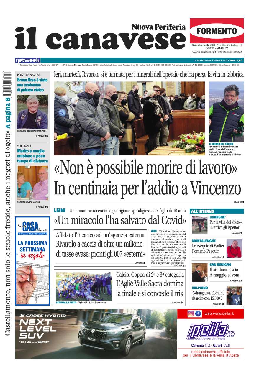 Come ogni settimana sono tantissime le notizie che troverete su Il Canavese – edizione Rivarolo. In questa edizione in primo piano l’ultimo saluto a Vincenzo Pignone, l’operaio morto sabato 22gennaio dopo essere caduto nella sabbiatrice mentre lavorava in una ditta di Busano. Lutto anche a Pont che ha detto addio a Bruno Orso, storico ex dipendente comunale. A Volpiano marito e moglie muoiono a poco tempo di distanza. A Leini il racconto di una madre: “Mio figlio di 10 anni salvato da un miracolo dal Covid”. Il Comune di Rivarolo è a caccia delle tasse evase: mandato ad un’agenzia per il recupero dei crediti. A Cuorgnè in arrivo gli ispettori alla villa del boss sotto sequestro. A Castellamonte negozi al freddo per un disservizio che il distributore di energia non risolve da anni. A San Benigno le dimissioni del sindaco: arriva il commissario e a maggio si va al voto. Il Comune di Volpiano risarcito con 15mila euro per il danno di immagine causato dalla ‘ndrangheta.