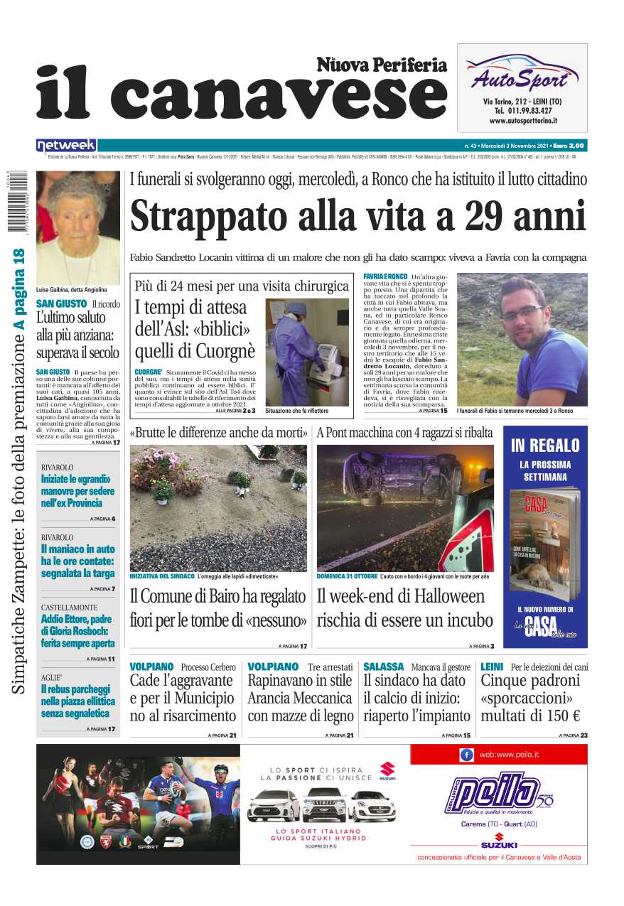 Come ogni settimana sono tantissime le notizie che troverete su Il Canavese – edizione Rivarolo. In questa edizione in primo piano l’improvvisa morte di Mario Sandretto Locanin, morto ad appena 29 anni per un malore improvviso. E poi i tempi di attesa biblici per le visite mediche con l’Asl: più di 24 mesi per una visita chirurgica. San Giusto dice addio a Luisa Galbina, aveva 105 anni. Incidente a Pont nel weekend di Halloween: auto si ribalta con quattro ragazzi a bordo. A Bairo il Comune ha deposto fiori sulle tombe che non vengono più accadute da nessuno.