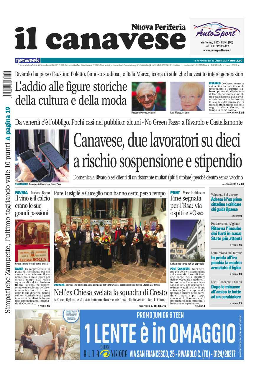 Come ogni settimana sono tantissime le notizie che troverete su Il Canavese – edizione Rivarolo. In questa edizione in primo piano l’obbligo di Green pass che da venerdì entrerà in vigore per tutti i lavoratori, pochi casi in Canavese nella pubblica amministrazione di No-Pass. Lutto e Rivarolo per la scomparsa di Faustino Poletto, famoso studioso, e a Cuorgnè per la morte di Itala Marco, icona di stile che ha vestito intere generazioni. Primo consiglio comunale a Cuorgnè dopo le elezioni: si è insediata la Giunta Cresto. La Rsa di Pont verso la chiusura: via ospiti e Oss. A Favria il ricordo di Luciano Rocca, un punto di riferimento per chi amava il vino e le uve, il suo nome era legato anche alla locale squadra di calcio: una colonna della comunità favriese.