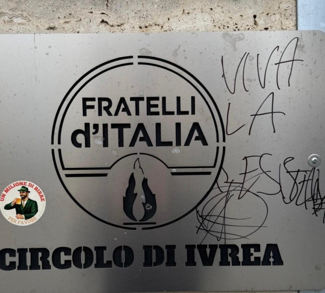 “Viva la resistenza”, “Acab” e simboli dell’anarchismo sono alcune delle scritte ritrovate nella mattina di venerdì 13 febbraio, all’indomani del Giovedì Grasso, sulle insegne esterne della di Fratelli d’Italia di Ivrea. Il caso ha ovviamente suscitato l’indignazione del circolo politico eporediese, che ha prontamente emesso un comunicato a firma del coordinatore cittadino Fabrizio Lotito: “Ieri mattina abbiamo trovato la nostra sede imbrattata con scritte a contenuto politico contro le forze di polizia, che noi sosteniamo ogni giorno con convinzione e rispetto. Non si tratta di una bravata: è un atto di intimidazione vero e proprio. Arriva puntuale dopo la nostra denuncia contro degrado e illegalità in città e dopo aver espresso solidarietà al proprietario del bar della stazione per l’ennesima rissa nel dehor del suo locale. Chi compie questi gesti dimostra di non avere alcun rispetto per le regole, per il confronto civile e per le forze dell’ordine. Colpire una sede politica per le sue posizioni a difesa della legalità significa voler zittire con la paura chi chiede semplicemente più sicurezza e più controllo del territorio”.