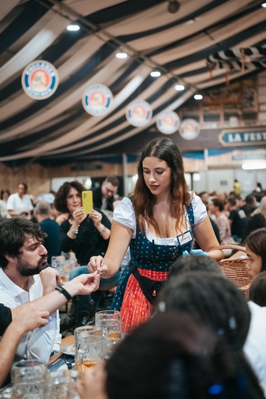Protagonista assoluta è la birra Paulaner, servita nei tradizionali boccali da un litro (Maß) da oltre 70 giovani in abiti tipici bavaresi – dirndl per le ragazze, lederhosen per i ragazzi – affiancati dalle immancabili Bretzeline, con i loro cesti di brezel caldi.