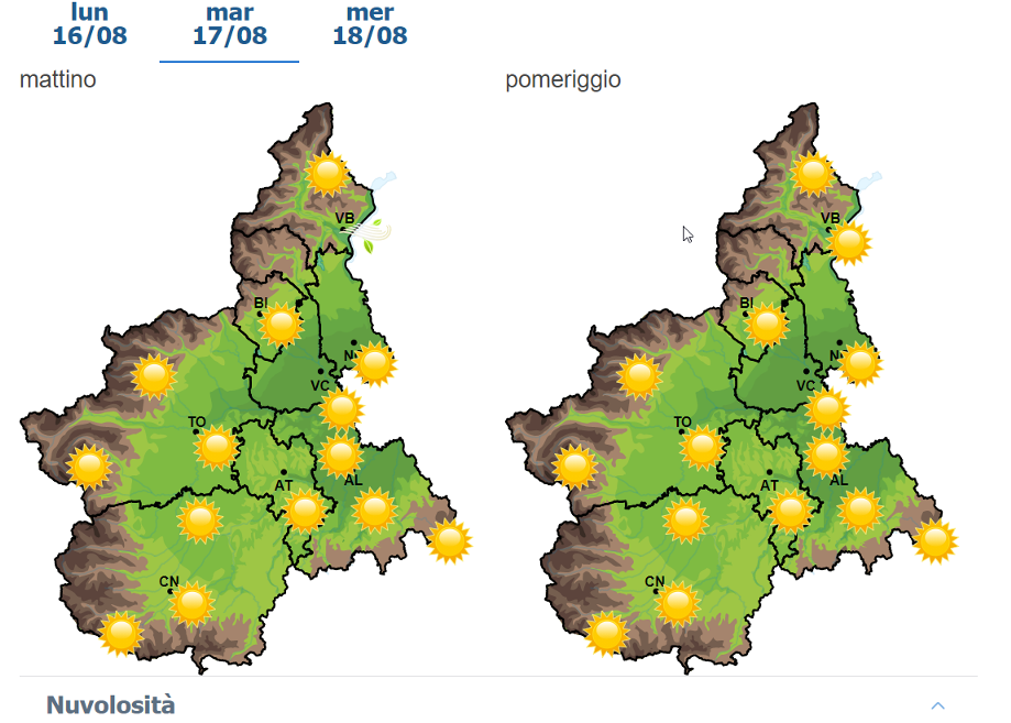 Sul Piemonte il grande caldo comincia a mollare un po’ la presa. Dopo l’esplosione di caldo africano dei giorni scorsi, gli esperti prevedono fino a giovedì, un progressivo calo delle temperature, pur sempre in condizioni di tempo prevalentemente sereno. Da venerdì la tendenza si invertirà, e si prevede un altro fine settimana con temperature percepite ben oltre i 30 gradi.