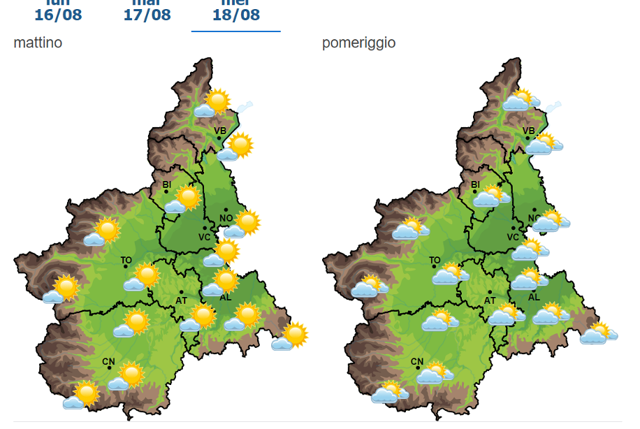 Mercoledì 18 agosto. La giornata di mercoledì, inizierà con un cielo poco nuvoloso. Poi è atteso un graduale aumento della copertura nuvolosa nel corso della giornata fino a cielo nuvoloso in serata. Non sono previste precipitazioni sul territorio regionale.