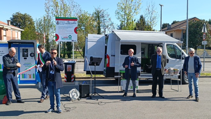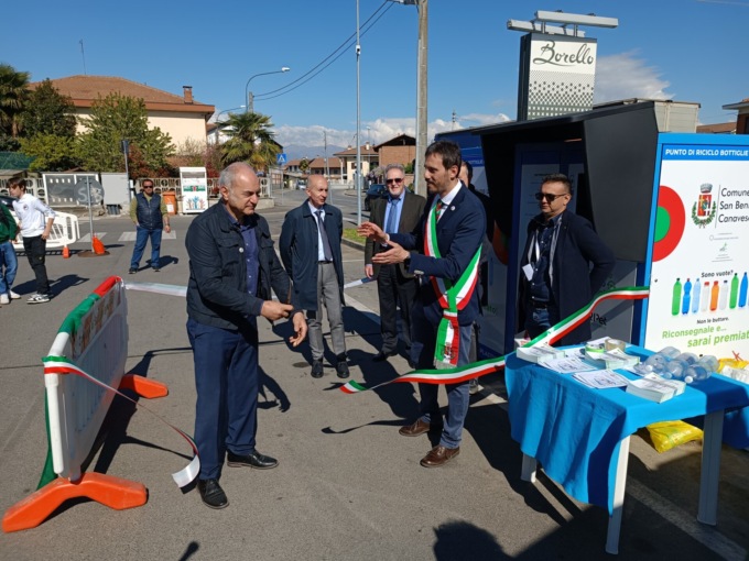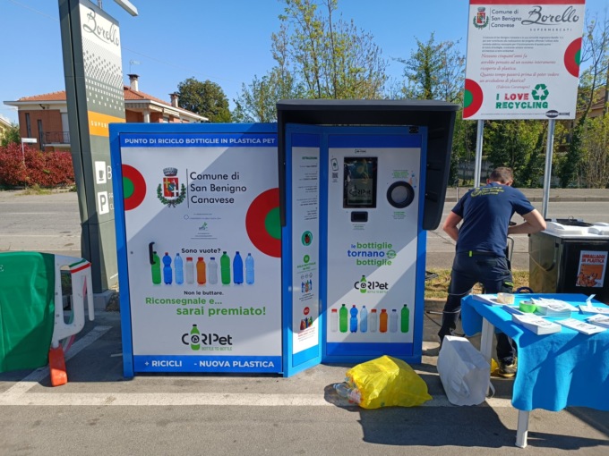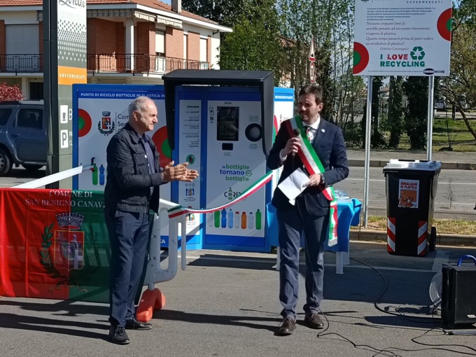 Riciclare le bottiglie di plastica fa vincere premi, grazie al nuovo compattatore Coripet inaugurato a San Benigno lunedì 17 aprile 2023.