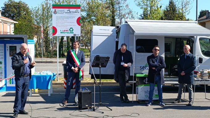 É la tutela ambientale l’obiettivo del nuovo compattatore di bottiglie di plastica Coripet, inaugurato a San Benigno la mattina di lunedì 17 aprile 2023 nel piazzale di fronte al supermercato Borello in via Bianco 36. All’evento hanno preso parte non solo membri dell’Amministrazione comunale ma anche vertici degli enti coinvolti nel progetto: Alessandro Casotti (responsabile gestione servizi ambientali Coripet), Gianluca Ballurio (direttore Consorzio Bacino 16), Massimo Bergamini (presidente Seta spa), Fiorenzo Borello (titolare della catena di supermercati). Ad assistere al taglio del nastro anche studenti dell’Istituto Comprensivo sanbenignese e delle scuole salesiane.