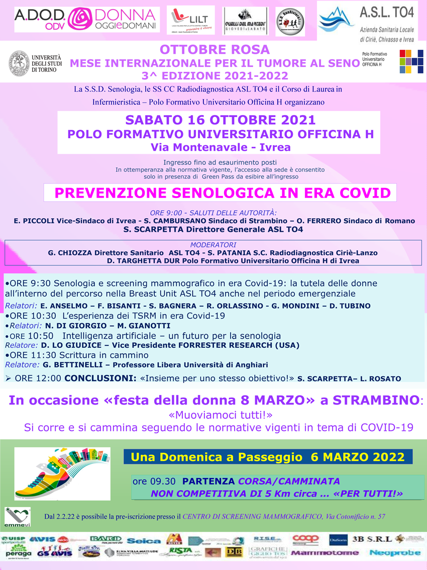 In occasione di Ottobre Rosa, Mese internazionale della prevenzione del tumore al seno, per sabato 16 ottobre a Ivrea (Polo Formativo Universitario Officina H, via Montenavale) le strutture di Senologia e di Radiodiagnostica dell’ASL TO4 e il Corso di Laurea in Infermieristica-Polo Formativo Universitario Officina H organizzano un incontro scientifico divulgativo sul tema della prevenzione senologica in epoca Covid. L’incontro, che si terrà dalle ore 9 alle 13, è aperto alla popolazione con ingresso fino a esaurimento posti. In ottemperanza alla normativa vigente, l’accesso alla sede è consentito solo in presenza di Green Pass da esibire all’ingresso.