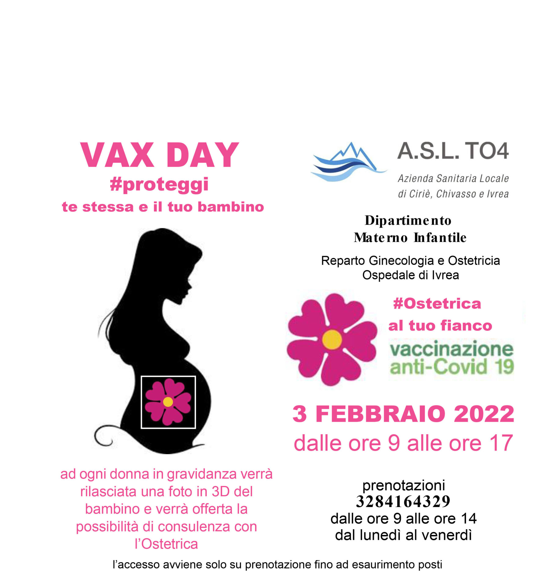 L’accesso avviene su prenotazione, telefonando al numero di cellulare del reparto 328 4164329 dalle ore 9 alle 14 da lunedì a venerdì, fino a esaurimento posti. In occasione della vaccinazione, sarà consegnata una foto in 3D del bambino e offerta la possibilità di consulenza con l’Ostetrica. Si tratta di un’iniziativa pilota che sarà riproposta in date successive e presso gli altri presidi dell’Azienda.