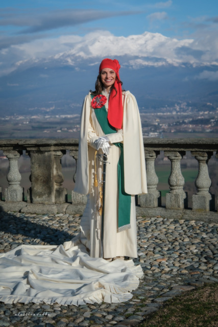 «Per me Violetta rappresenta la libertà – racconta Valentina Campesato – e mi sento molto fortunata perché mi riconosco nel significato di questa parola, ancorata ai valori profondi che mi ha trasmesso la mia famiglia, e che ora condivido con mio marito nella libertà di amarci reciprocamente, di progettare e costruire la nostra vita insieme». Ed anche il senso di libertà collettiva racchiuso nell’allegoria dello Storico Carnevale di Ivrea attraverso i suoi innumerevoli riti: «Del popolo che si ribella al tiranno – aggiunge ancora – e di una città che si unisce e partecipa». Tant’è che l’augurio della Vezzosa Mugnaia per l’edizione 2026 della kermesse è: «Di vivere la nostra festa in libertà, senza tralasciare i valori e le tradizioni che la contraddistinguono, liberi ma fedeli alla nostra storia».
