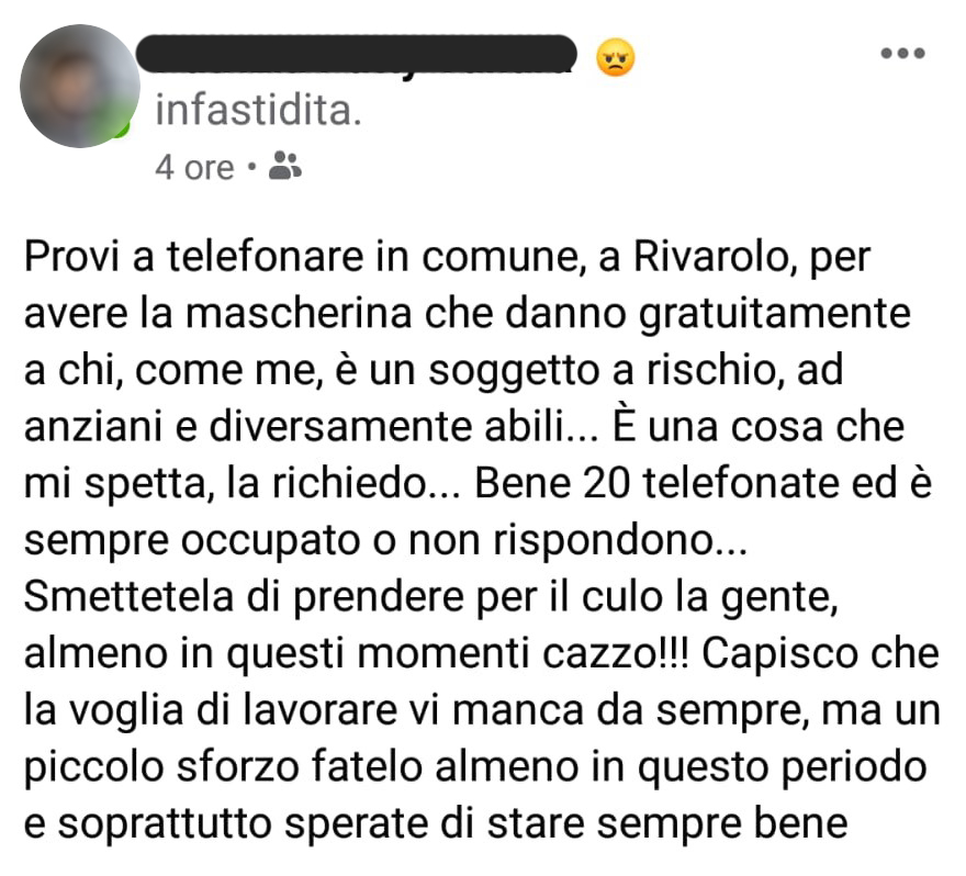 “Provi a telefonare in comune, a Rivarolo – scrive una cittadina – per avere la mascherina che danno gratuitamente a chi, come me, è un soggetto a rischio, ad anziani e diversamente abili… E’ una cosa che mi spetta, la chiedo… Bene 20 telefonate ed è sempre occupato o non rispondono… Smettetela di prendere per il XXXX la gente, almeno in questi momenti xxxxx!!! Capisco che la voglia di lavorare vi manca da sempre ma un piccolo sforzo fatelo almeno in questo periodo e soprattutto sperate di stare sempre bene”.