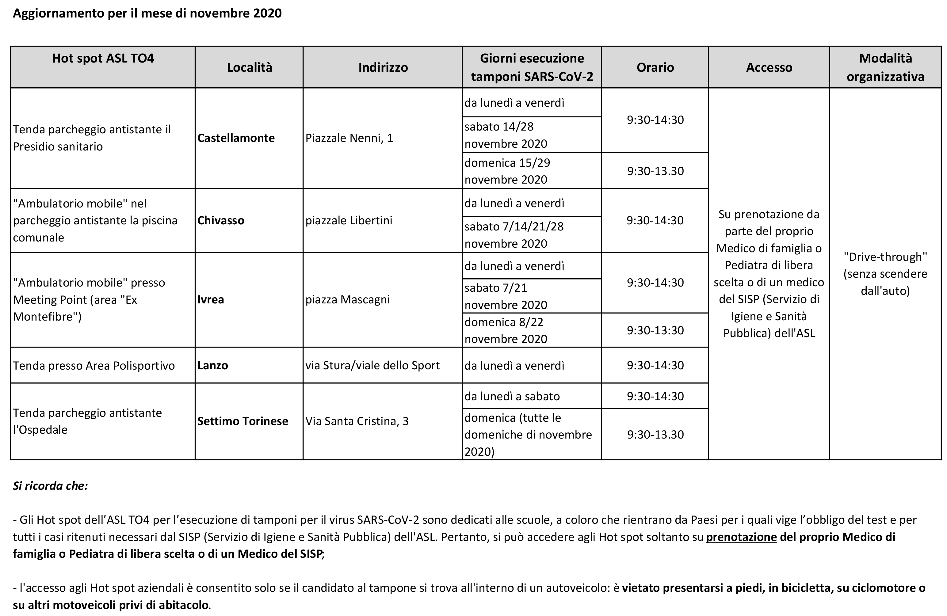 Da domani, mercoledì 4 novembre 2020, si accede su prenotazione agli Hot spot (“Drive-through”) aziendali dedicati all’esecuzione di tamponi per il virus SARS-CoV-2 per le scuole, per il rientro da Paesi per i quali vige l’obbligo del test e per tutti i casi ritenuti necessari dal SISP (Servizio di Igiene e Sanità Pubblica) dell’ASL.