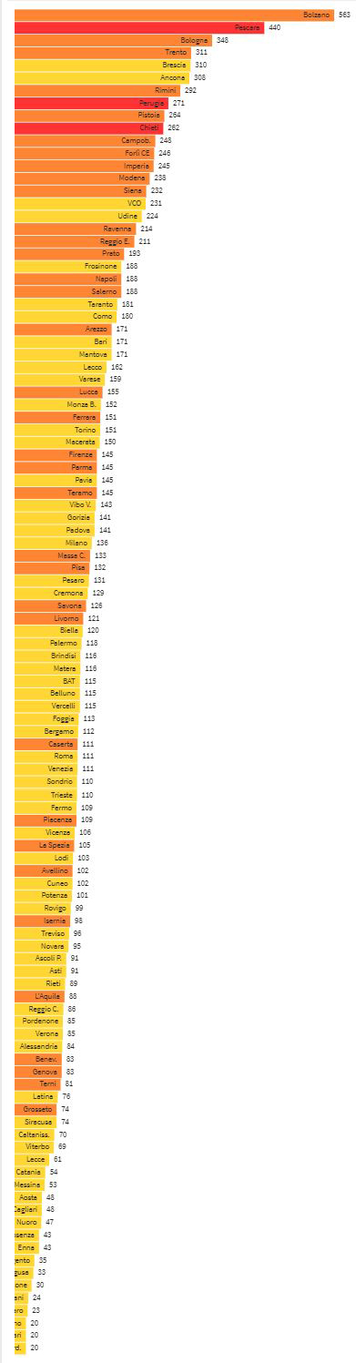 In questo schema, le Province italiane sono elencate in ordine di incidenza, da quelle con maggiore circolazione virale a quelle meno esposte. È interessante confrontare il posizionamento di ogni Provincia con il colore che ognuna ha per via del sistema di attribuzione delle Regioni rosse, arancioni e gialle, che non tiene conto della notevole disomogeneità delle Province all’interno della stessa Regione. In molti casi, si nota che le misure di contenimento sono più stringenti di quanto spetterebbe alla Provincia in termini di incidenza, in altri casi lo sono meno. Torino si trova al 33°posto con Ferrara.