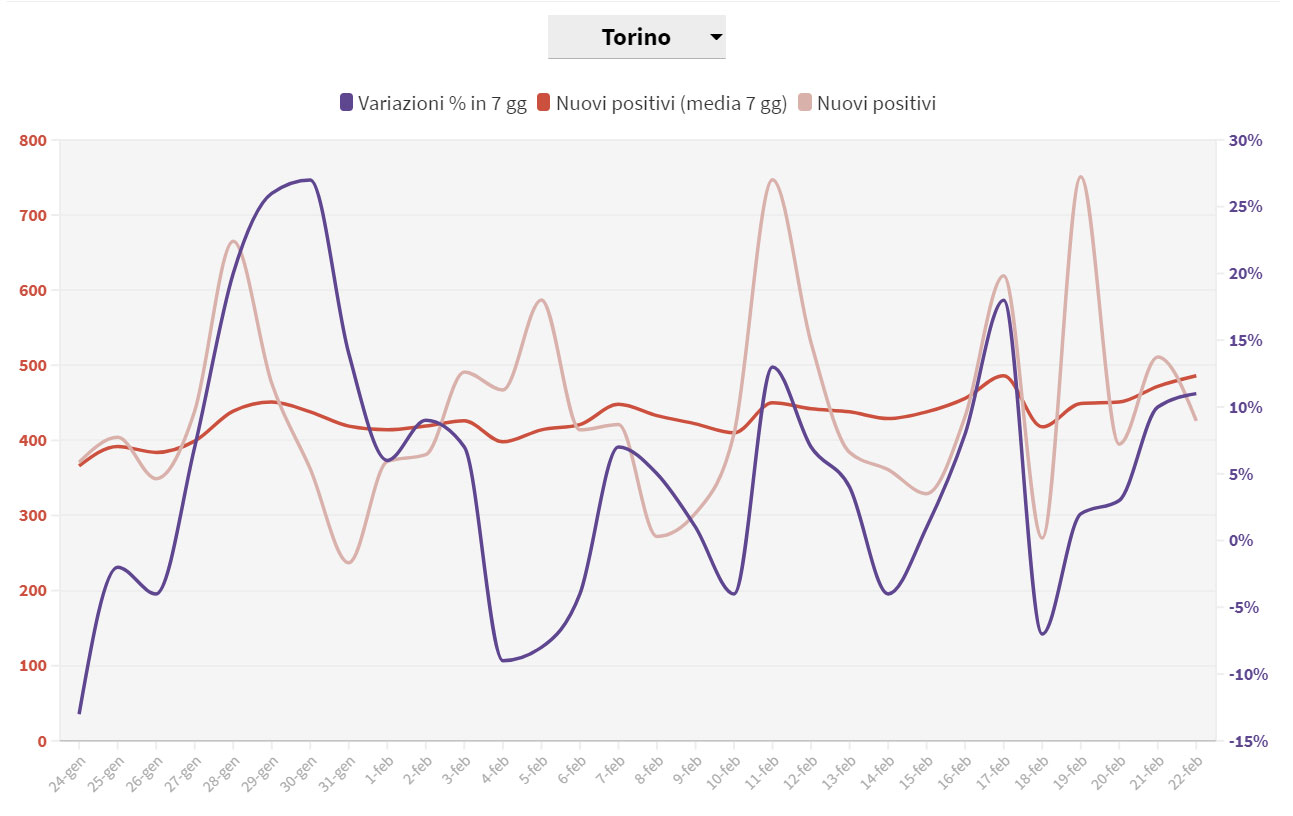 Secondo i dati elaborati nel grafico, l’incidenza nella provincia di Torino sarebbe pari a 151 casi ogni 100.000 abitanti in 7 giorni, a fronte di una soglia regionale pari a 202. L’aumento percentuale dei casi, rispetto alla scorsa settimana è del 13%.