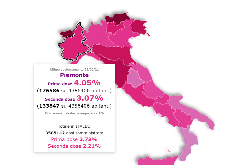 Intanto si procede con le vaccinazioni. Ad oggi sono state somministrate 3.608.645 dosi di vaccino, a 1.336.126 persone sono state somministrate la prima e la seconda dose. In Piemonte le somministrazioni sono state 311.013.
