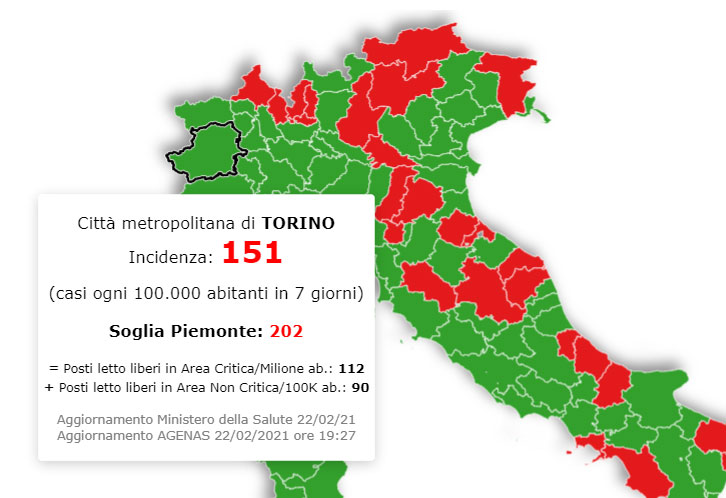 Una rubrica che analizza la situazione non solo dal punto di vista regionale, ma anche da quello provinciale. Ebbene, secondo i dati aggiornati a ieri, lunedì 22 febbraio 2021, la nostra provincia resta ancora sotto la cosiddetta soglia critica fissata per la Regione Piemonte a 202. Il suo modello (la fonte dati per quanto riguarda l’incidenza è il Ministero della Salute mentre quella sulla disponibilità dei posti letto è AGENAS) si basa sulla incidenza del contagio da Coronavirus sul numero di abitanti, rapportato alla capacità ospedaliera della singola Regione.