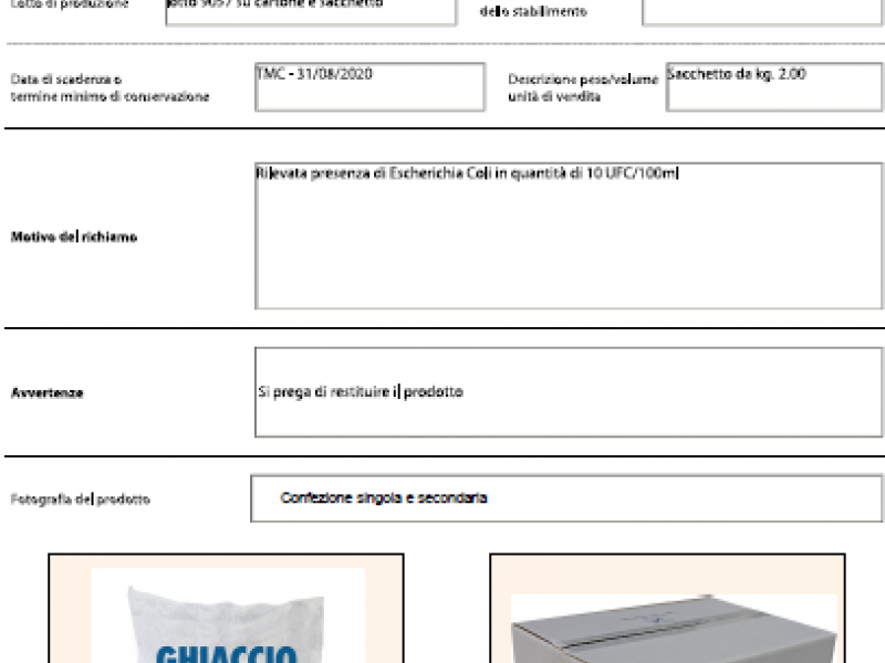 Rischio microbiologico per contaminazione da E coli. Questo il motivo che ha spinto il ministero della Salute a diffondere un avviso di richiamo di un lotto di ghiaccio a cubetti per cocktails a marchio Polo Nord Ice Cubes per conta batterica fuori dai limiti. Il prodotto interessato è venduto in sacchetti da 2 kg con il numero di lotto 9057 su cartone e sacchetto e il termine minimo di conservazione 31/08/2020.