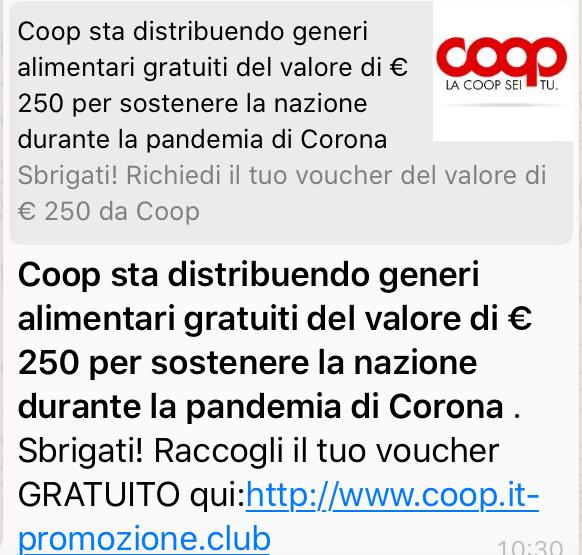 I truffatori, in particolare, citando la pandemia e le difficoltà di moltissime persone, attraverso il seguente messaggio: “Coop sta distribuendo generi alimentari gratuiti del valore di 250 euro per sostenere la nazione durante la pandemia di Corona. Sbrigati! Raccogli il tuo voucher GRATUITO qui: http://www.coop.it-promozione.club” , invitano ignari cittadini a cliccare su un falso sito internet della Società Coop e a inserire i propri dati anagrafici per garantirsi il voucher da 250 euro.