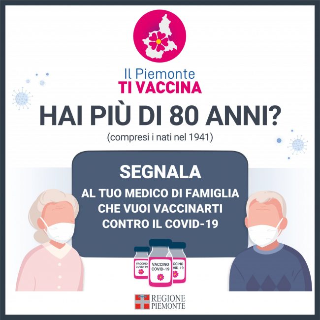 Da lunedì 15 febbraio le persone con più di 80 anni (nati nel 1941 compresi) potranno segnalare la loro volontà di ricevere il vaccino al proprio medico di famiglia. Ogni medico indicherà eventuali priorità sulla base del quadro clinico dell’assistito e ne registrerà l’adesione sull’apposita piattaforma regionale. L’Asl di competenza provvederà a definire gli appuntamenti e a indicare luogo, data e ora della convocazione per la vaccinazione tramite sms o mail (si può indicare anche un cellulare/mail di un parente o altra persona fidata).