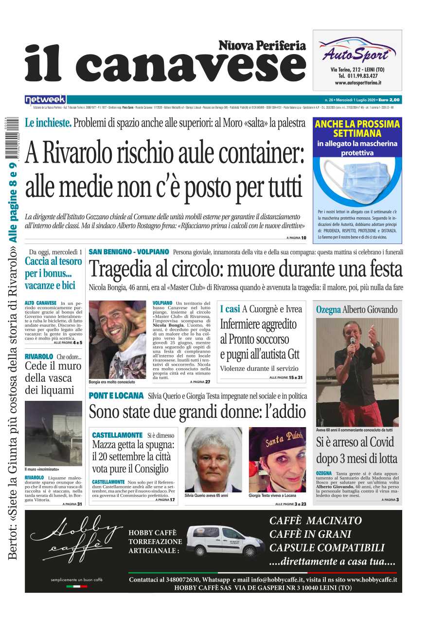 Come ogni settimana sono tantissime le notizie che troverete su Il Canavese – edizione Rivarolo. In questa edizione abbiamo cercato di capire quale sarà il futuro per le classi degli istituti del nostro territorio, come sarà strutturata la scuola quando a settembre si tornerà in classe. Poi gli episodi di violenza a Ivrea, con l’autista Gtt aggredito, e Cuorgnè, dove ad essere stato preso a pugni è stato un infermiere del Pronto Soccorso. E ancora lutto a Volpiano per l’improvvisa morte di Nicola Bongia, 46 anni, colpito da un malore improvviso e fatale durante una festa al Master Club di Rivarossa. E poi la scomparsa di due grandi donne: Silvia Querio a Pont e Giorgia Testa a Locana, impegnate nel sociale e in politica. E ancora il lutto a Ozegna: Alberto Giovando ha perso la sua battaglia contro il Coronavirus, era stato il primo positivo in Canavese, si è arreso dopo 3 lunghi mesi di battaglia. Poi a Castellamonte dove il sindaco Mazza si è dimesso, nell’attesa delle elezioni a settembre, in città è arrivato il commissario prefettizio.