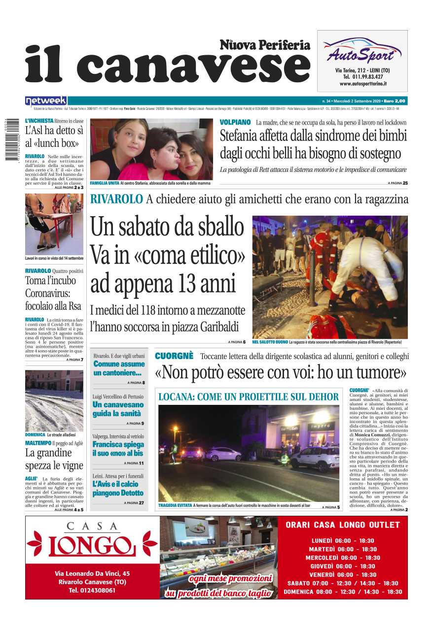 Come ogni settimana sono tantissime le notizie che troverete su Il Canavese – edizione Rivarolo. In questa edizione caso di una ragazzina di appena 13 anni che sabato sera ha rischiato la vita a Rivarolo dopo aver bevuto alcool insieme agli amici. Poi la storia di Stefania, una ragazzina volpianese affetta dalla “sindrome degli occhi belli” che ha bisogno di sostegno: la mamma durante il lockdown ha perso il lavoro. E ancora a Rivarolo torna l’incubo Coronavirus: in città sono quattro i casi di positività, focolaio alla Rsa. E poi il maltempo che domenica scorsa si è abbattuto sul Canavese con danni ingenti sopratutto ad Agliè dove la grandine ha causato ingenti danni ai vigneti. E ancora la struggente lettera della dirigente scolastica cuorgnatese a insegnanti, genitori e ragazzi: “Non potrò essere con voi: ho un tumore”. E ancora: a Rivarolo l’Asl ha detto sì alla richiesta del Comune di poter servire i pasti in classe.